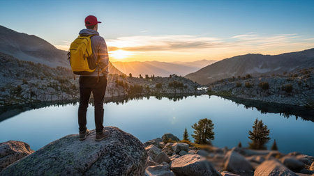 Hike in the mountains. A man with a backpack stands on the shore of a mountain lake and looks at the sunset.