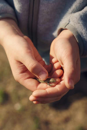 A person stands with hands held in front of a mound of various shells. The individual appears to be examining the shells closely, possibly collecting or admiring them.
