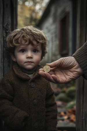 A young child receives a coin from an elderly person. The poignant scene evokes themes of generosity and childhood innocence.