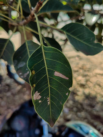 Stock photo of Banyan tree leaf on blur blur background, It have healing and anti microbial properties. Picture captured at gulbarga,Karnataka, India. focus on object