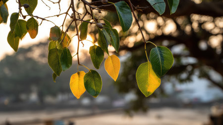 Leaves of the Bodhi tree glow brightly as the sun rises, showcasing a stunning display of colors in the early morning light.
