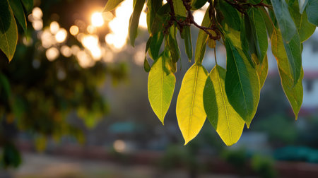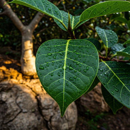 Bodhi tree leaves glow in the early morning sunlight, highlighting their green hues and intricate shapes against a softly blurred background.