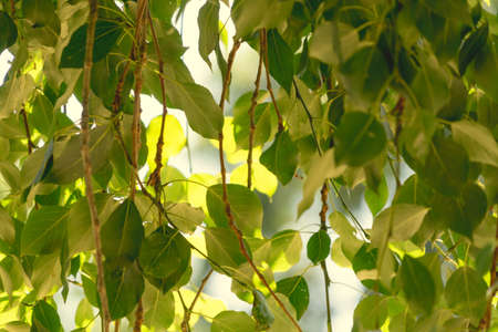 Ficus religiosa green leaves branch hanging on tree closeup in the temple.