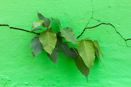 Bodhi tree growth emerging from the cracks of a green wall