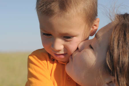 Mother kissing little boy in the summer