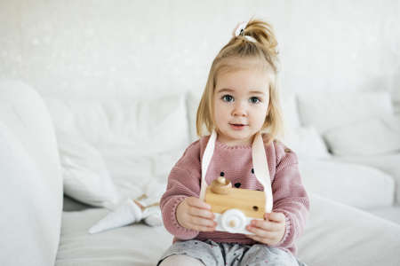 Small adorable girl holding wooden toy photo camera and take picture. Talented children