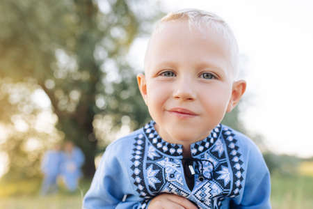 Happy child boy plays and lies on grass on meadow during walk. He is dressed in Ukrainian national embroidered shirt.