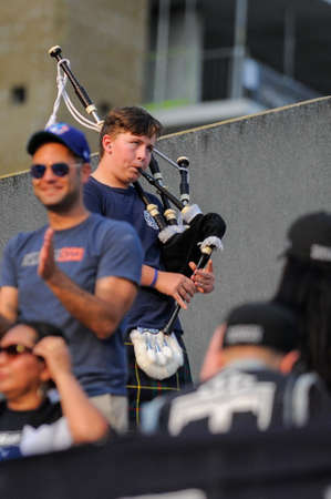 Minsk/ Belarus - October 31 2018: piper plays the bagpipes in the park