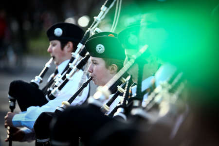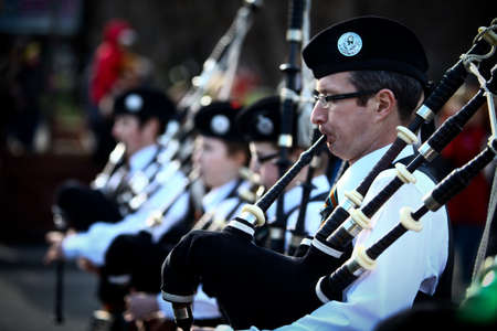 Bucharest, Romania - March 16, 2014: Performers play bagpipes during a parade celebrating Saint Patrick's day in Bucharest, Romania. Saint Patrick is the patron saint of Ireland and credited with bringing Christianity to Ireland.
