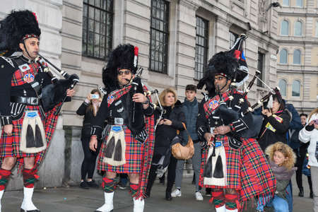 MUNICH, BAVARIA, GERMANY - MARCH 13, 2016: Bagpipers in traditional Scottish clothes at the St. Patrick's Day Parade.