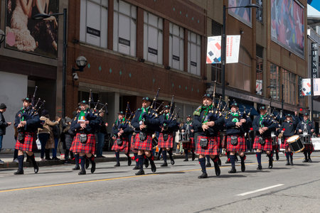Toronto, ON, Canada – March 20, 2022: Drummers and Pipers Take Part in a St Patrick's Day Parade in Downtown Toronto. Saint Patrick's Day is a Religious Holiday Celebrated Internationally on 17 March It is Named After Saint Patrick the Most Commonly Rec