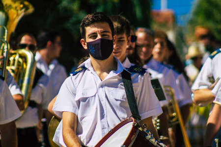 Carmona Spain September 26, 2021 Focus of members of a local music orchestra playing music in the streets of Carmona during the coronavirus epidemic hitting Spain