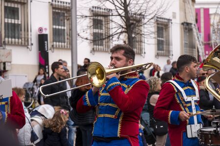 Italy, Verona, May 31, 2019: An orchestra of military trumpeters plays trumpets at a street performance.