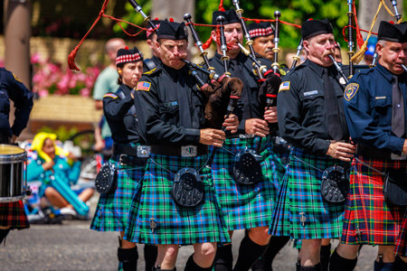 Portland, Oregon, USA - June 10, 2023: Portland Police Highland Guard Pipe Band in the Grand Floral Parade, during Portland Rose Festival 2023.
