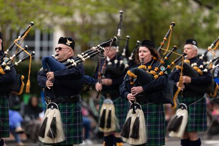 Portland, Oregon, USA - JUNE 7, 2014 Clan Macleay Pipe Band in Grand floral parade through Portland downtown