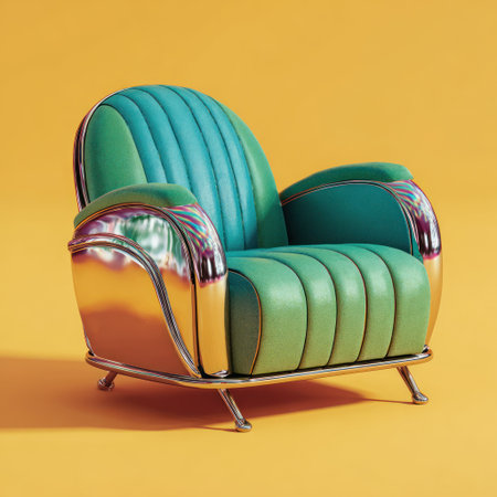 A vibrant art-deco style armchair with chrome accents, against a yellow backdrop