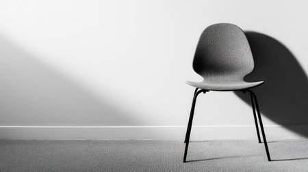 A chic, minimalist grey chair sits alone against a simplified wall, casting a gentle shadow, perfect for those seeking modern interior design inspiration.