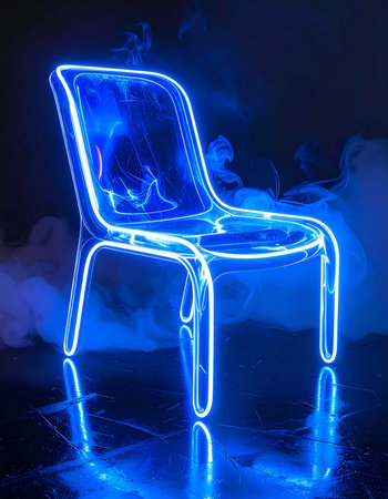 An empty chair, outlined in a vibrant electric blue neon, sits alone in a dark room filled with ethereal smoke.