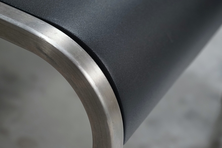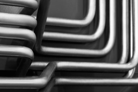 Close-up street bench metal pipes arranged parallel to each other on a street structure. Concept for weather resistant materials and modern industrial design. Advertising space