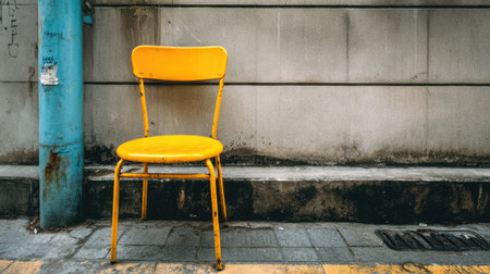 A striking yellow chair stands alone on a sidewalk, presenting a vibrant contrast against a textured wall, perfect for urban-themed interior design projects or photography.