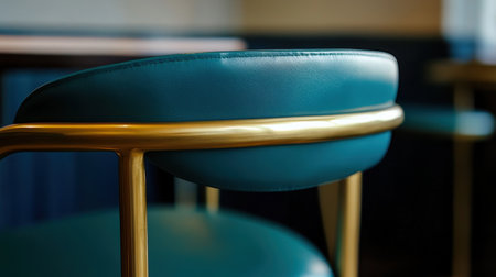 A close-up view of a stylish modern chair featuring a smooth teal upholstery and elegant gold accents, perfect for enhancing contemporary interiors in cafes or restaurants.