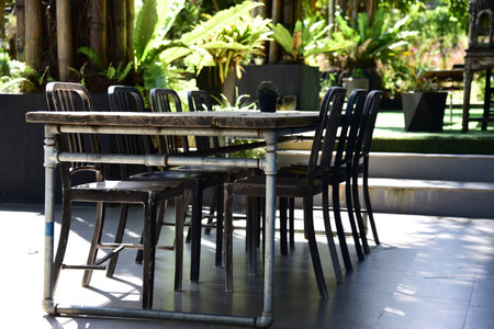 Several chairs are arranged neatly on top of a grey cement floor, creating a simple and functional seating area. The chairs are empty, suggesting a space waiting to be used.