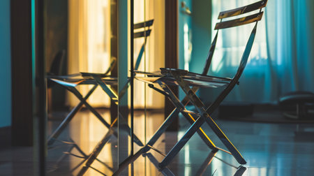 Angular shadows of metal chairs fall across a smooth grey floor, creating a dramatic contrast of shapes and lines in natural light.