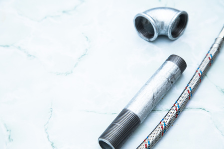 Various plumbers tools and plumbing materials including stainless steel pipe, elbow joint, wrench and spanner. Bright white marble background. Top view, copyspace