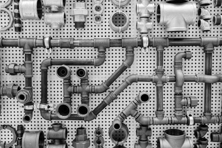 Wall of pipes and fittings with black and white filter. Industrial and mechanical background concept