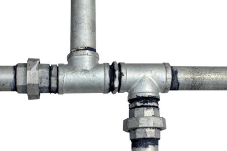 Various plumbers tools and plumbing materials including stainless steel pipe, elbow joint, wrench and spanner. White background. Top view, copyspace