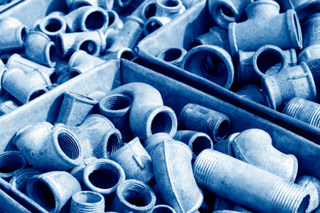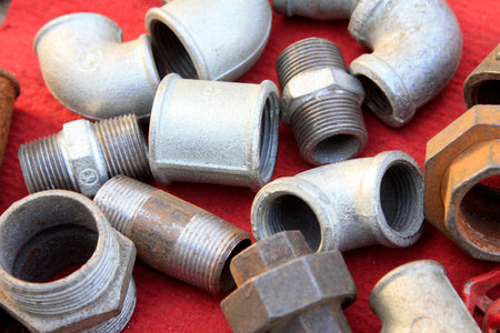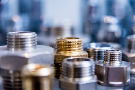 Metal plumbing fittings used to repair the water system. Accessories and spare parts for mechanics. Dark background.