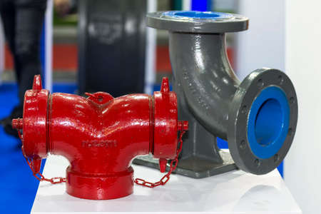 Hosepipe fittings on the table. Plumbing pipeline spare parts. Background