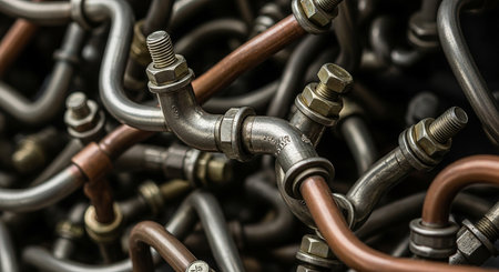 Reflective metal piping network displaying precision craftsmanship, set against a stark white backdrop, symbolizing advanced engineering and seamless industrial syst