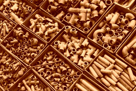 A wall of pipes and fittings with a variety of sizes and shapes. The wall is organized and the pipes are displayed in a way that makes it easy to see the differences between them