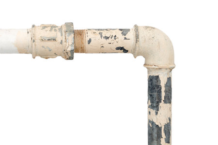 curve old water pipe on white background. The pipe is covered with paint that has fallen off, peeled off. Horizontal photo