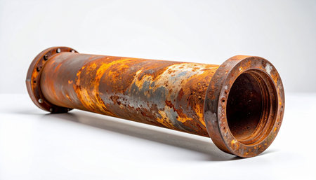 A heavily rusted industrial metal pipe with flanges on both ends lies horizontally on a white background, showcasing its textured, corroded surface.