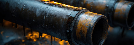 Large industrial pipes exhibit signs of wear with black oil dripping from joints in a damp, industrial setting, emphasizing deterioration.