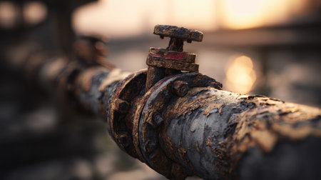 Weathered steel pipes and rusted joints create a rugged texture under sunset light. This scene highlights the endurance of industrial infrastructure.