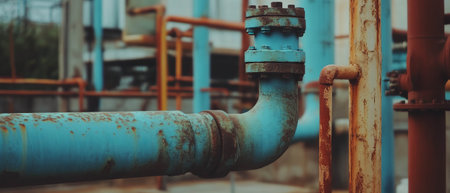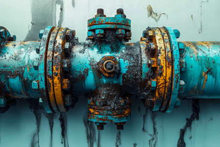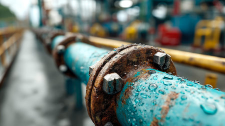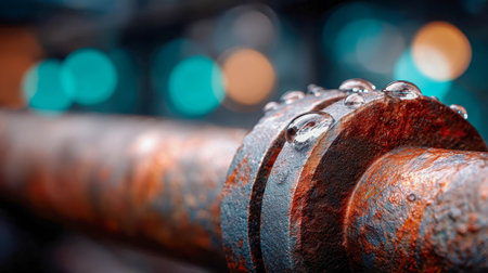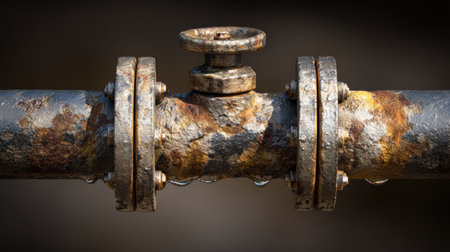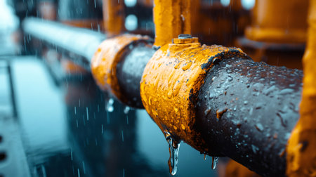 Close-up image showcasing a rusty valve on an industrial pipeline. Water droplets cling to the worn surface, emphasizing the effects of age and exposure in infrastructure.
