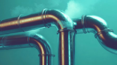 A close-up view of shiny industrial pipes curving and converging, emitting steam against a soft blue background, highlighting fluid dynamics and structure.