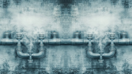 This image features industrial pipework emitting steam against a textured grungy background, ideal for use in engineering and design-related projects.