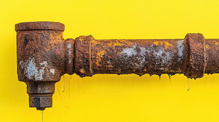 A close-up of a rusty metal pipe exhibiting drips of water against a vibrant yellow background, capturing the beauty of industrial decay and texture.