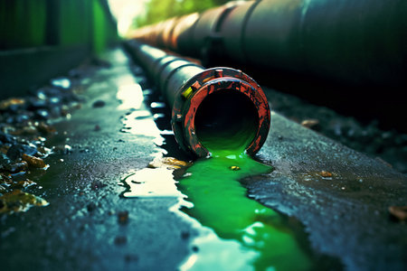 Close-up view illustration of a broken industrial pipe leaking a green liquid onto the ground. Generative AI.
