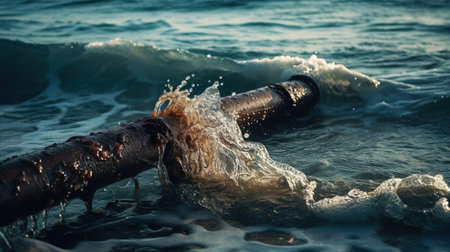 A pipe with a hole in it is leaking oil into the water, AI