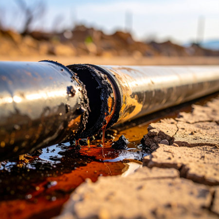 A close-up view captures a critical failure in an industrial pipeline, with viscous crude oil seeping from a rupture and contaminating the dry, cracked earth below.