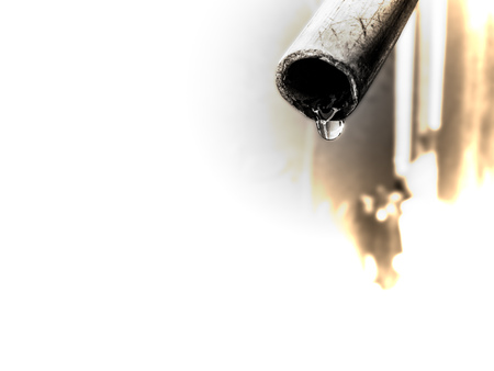 A pipe is dripping oil and water. The oil is yellow and the water is blue. The image has a mood of sadness and despair