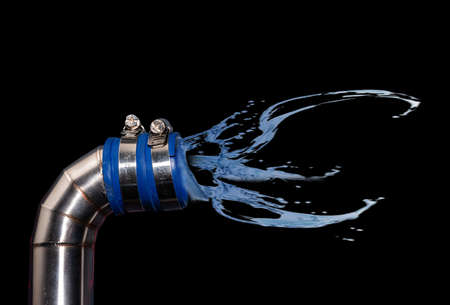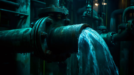 Close up of water gushing from a leaking pipe in an industrial setting, highlighting the concepts of water waste, industrial accidents, and plumbing issues