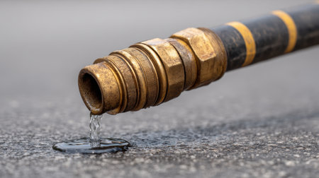 Close-up of a leaking water hose nozzle on an asphalt surface. The metal connector shows signs of wear, with droplets forming and pooling on the ground.