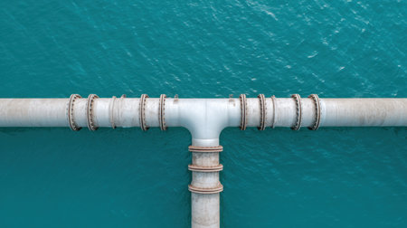 This aerial image captures large industrial pipes crossing over tranquil aqua waters, showcasing modern infrastructure and engineering in an urban environment.