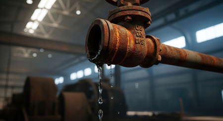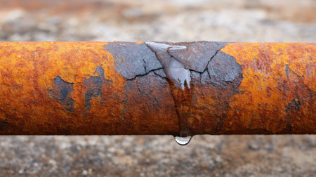 Close-up of a corroded metal pipe with water droplet at the joint, highlighting the texture and deterioration in an industrial setting